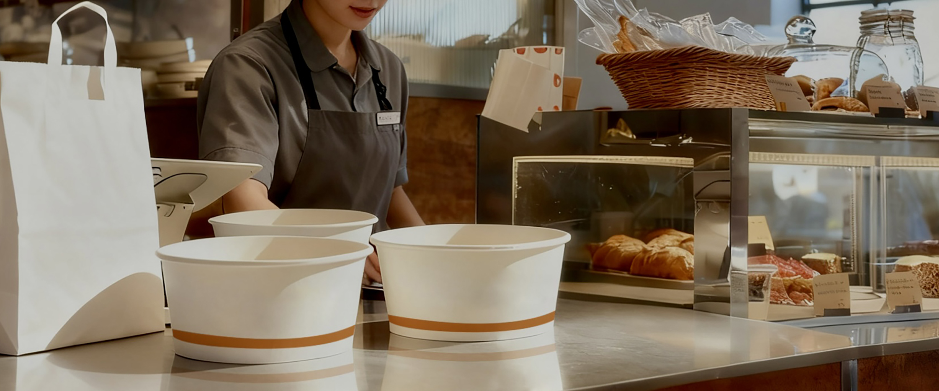 Servizio PRO nel settore dell'imballaggio alimentare. Al giorno d'oggi i marchi della ristorazione e i consumatori preferiscono i contenitori di carta per l'imballaggio da aspor...